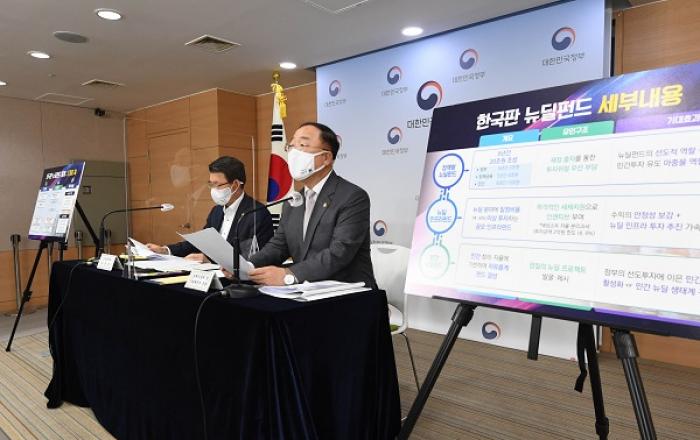 정부가 공공자금 7조원과 민간자금 13조원을 합쳐 한국판 뉴딜 사업에 투자하는 ‘뉴딜펀드’를 조성한다. 또 공모형 펀드인 ‘뉴딜 인프라펀드’에는 민간 자금을 끌어들이기 위해 투자액 기준 2억원 한도로 9%의 저율분리과세를 적용한다.▲ 홍남기 부총리 겸 기획재정부 장관