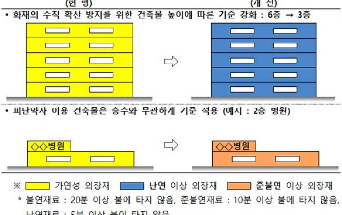 앞으로는 학교나 병원처럼 어린이·노인·환자 등이 이용하는 건물에는 불에 취약한 가연성 외장재를 사용할 수 없다.국토교통부는 이 같은 내용을 포함한 ‘건축법 시행령’ 개정안이 30일 국무회의를 통과했다고 밝혔다.개정안에 따르면 피난에 많은 시간이 걸리는 영유아, 어린이,