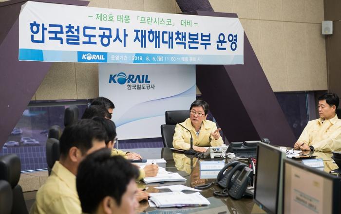 코레일이 6일 대전사옥 재해대책본부 상황실에서 태풍 ’프란시스코’ 대비 긴급 안전대책회의를 열고 집중호우, 강풍 등 재해 예방 대책을 점검했다.손병석 코레일 사장 주재로 열린 이번 회의에서 태풍의 이동 경로와 영향권을 확인하고 여객,시설,전기,차량 등 분야별 대응 계획