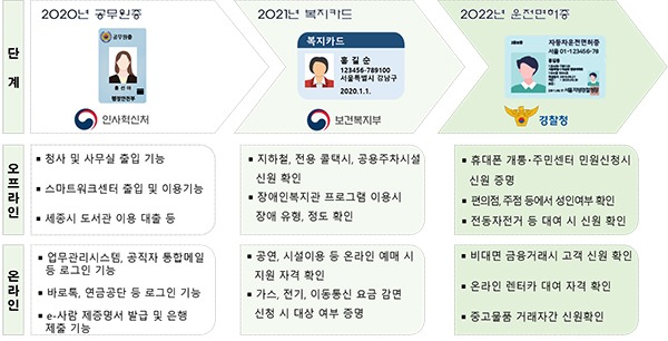 행안부는 올해에 공무원증을 대상으로 모바일 신분증의 편의성과 안전성을 검증한 뒤 2021년에는 장애인등록증(복지카드), 2022년에는 운전면허증으로 발급 범위를 확대해 나갈 계획이다.