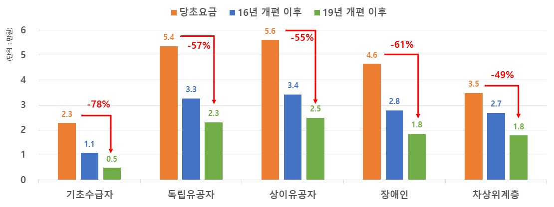 누진제 개편효과와 함께 복지할인 한도 확대효과를 적용하게 되면 기초수급자는 누진제 개편 이전에 비해 평균적으로 최대 78%까지 할인되는 효과가 나타나 월 평균 4,800원의 전기요금을 부담하게 된다.