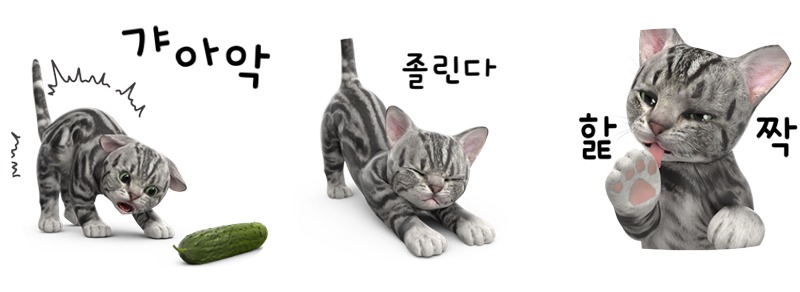 특히 ‘Jump! 냥이’ 이모티콘은 고양이의 표정 하나하나의 세밀한 움직임과 터럭·질감·원근감 등을 살린 3D 이모티콘으로, 풍부한 감정 표현이 가능하다.