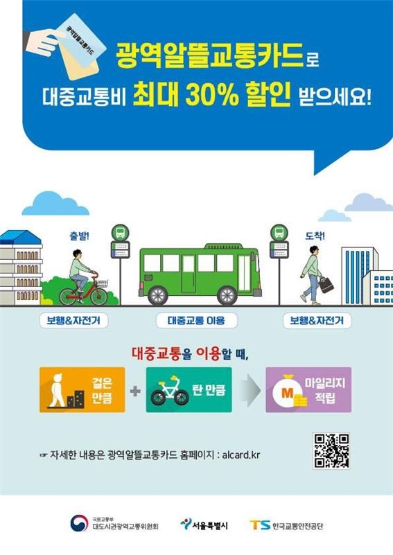 광역알뜰교통카드는 대중교통 이용 전·후로 보행, 자전거로 이동하는 만큼 마일리지(최대 20%)를 적립 받고, 카드사 추가할인 혜택(10%) 등을 포함해 대중교통 비용을 최대 30%까지 절감할 수 있는 카드다.