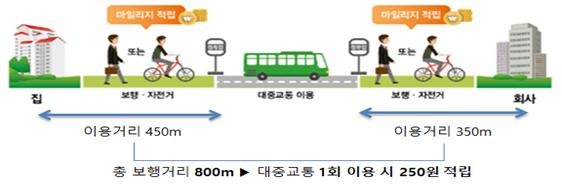 대중교통이용 전·후 걷거나 자전거 이동 시 적립한 마일리지만큼 대중교통 비용 지원