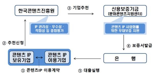 이에 콘진원은 콘텐츠IP를 활용한 사업계획을 평가하여 일정등급 이상 받은 콘텐츠기업을 신보에 추천한다. 신보는 콘진원 추천기업을 대상으로 보증심사를 진행해 사업화자금에 대한 보증상품을 지원한다. 뿐만 아니라 보증심사 시 콘진원 추천기업은 보증한도, 보증비율(90%), 보증료(최대 0.9%) 등 우대혜택을 적용받을 수 있다.