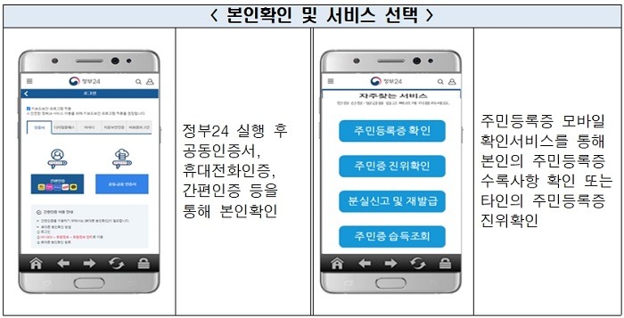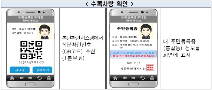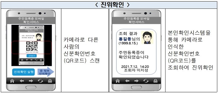 ‘주민등록증 모바일 확인서비스’는 ‘정부24’를 통해 본인확인 절차를 거친 후 신분확인번호(QR코드)를 수신하여 주민등록증 수록사항을 화면에 표시하거나 또는 스캔하여 타인의 주민등록증 진위여부를 확인하는 방식으로 이용하게 된다.