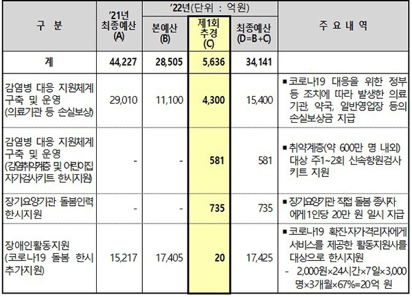 보건복지부는 21일 국회서 의결된 2022년 제1차 추가경정예산(추경)을 통해 총 5636억원의 코로나19 관련 복지예산을 확보했다고 밝혔다.