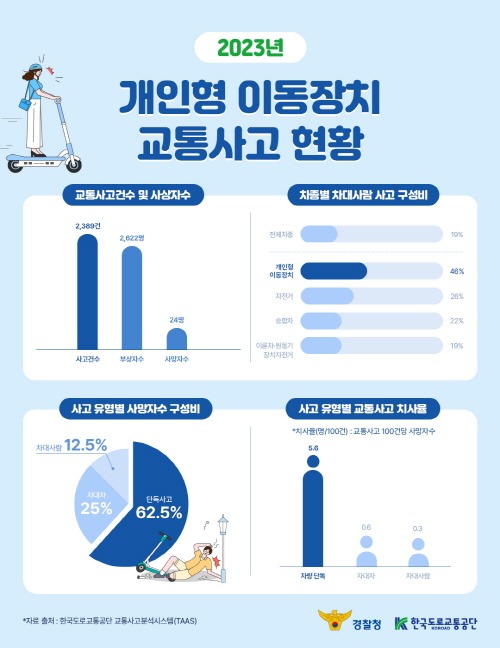 한국도로교통공단 교통사고분석시스템(TAAS)에 따르면 지난해(2023년) 개인형 이동장치로 인해 발생한 교통사고는 2,389건이며, 사망자수 24명, 부상자수 2,622명으로 전년(2022년)과 비슷한 수준이었다.