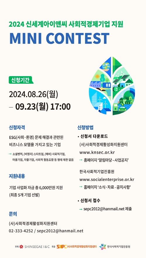 신세계아이앤씨(신세계I&C)가 ESG 관련 문제해결을 위한 사회적경제기업 지원 프로그램 ‘미니콘테스트’(MINI CONTEST) 참여기업을 모집한다.