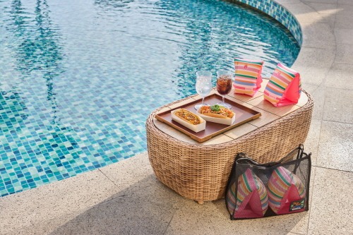 잇투오(EAT2O)에서 제공되는 ‘풀 사이드 서머 세트’는 물놀이 후 허기를 달래 줄 핫도그 2개와 생맥주 2잔 구성으로 이국적인 풍경 속 휴양지의 여유로움을 만끽할 수 있다.