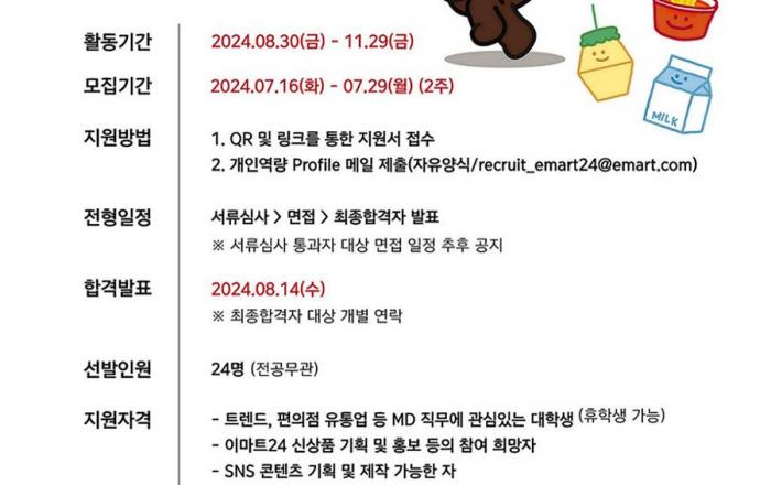 이마트24가 이달 16일(화)부터 29일(월)까지 24명의 대학생 MD서포터즈 ‘편슐랭 스타(이하, 편스타)’ 1기를 모집한다.이마트24는 편의점의 주요 구매층이자 트렌드를 선도하는 Z세대와의 소통을 강화하고, 이들의 톡톡 튀는 아이디어를 수렴하기 위해 편스타를 신설하