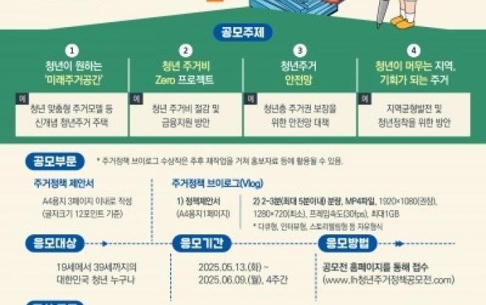 한국토지주택공사(LH)는 청년 주거정책 대국민(청년) 아이디어 공모전 '내일을 짓다!'를 개최한다고 13일 밝혔다.이번 공모전은 청년의 시각에서 다양한 주거수요를 끌어내고, 주거 문제를 해결할 수 있는 참신한 아이디어를 발굴하고자 마련됐다.5월 13일(화)부터 6월 9