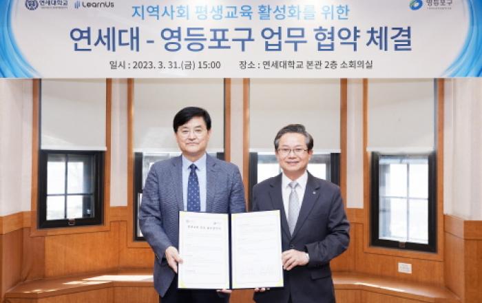연세대학교와 서울 영등포구는 연세대가 운영하는 온라인 교육 플랫폼 '런어스(LearnUs)'를 활용한 평생교육 활성화 협약을 체결했다. 3월 31일 연세대 본관에서 열린 협약식에는 연세대 서승환 총장과 최호권 영등포구청장을 비롯해, 연세대 김동훈 행정대외부총장, 연