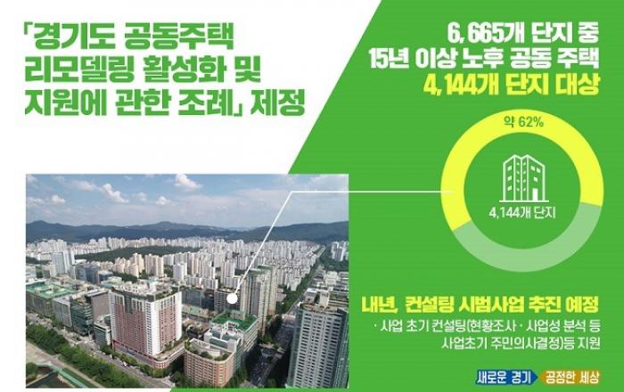 경기도가 15년 이상 된 노후 공동주택 리모델링 사업 활성화를 위해 자문단과 지원센터 등을 두고 사업 초기부터 시행까지 체계적 지원에 나선다.도는 이런 내용을 담은 ‘경기도 공동주택 리모델링 활성화 및 지원에 관한 조례’가 8일 공포, 시행된다고 밝혔다. 조례는 지난달