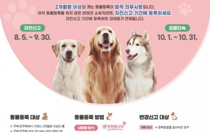 수원시가 동물의 유실·유기를 방지하고, 동물등록률을 높이기 위해 9월 30일까지 ‘동물등록 자진신고 기간’을 운영한다. 자진신고 기간에 동물등록을 하지 않은 시민이 동물을 등록하거나, 소유자 변경 등 동물등록 변경 신고로 동물등록 정보를 현행화하면 과태료가 면제된다.