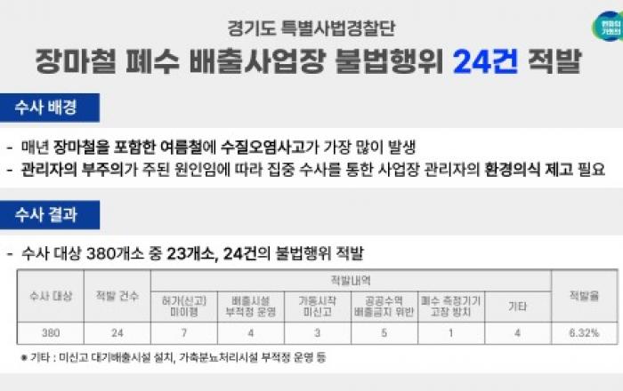 장마철 집중호우를 틈타 공공수역에 특정수질유해물질을 배출하거나 미신고 폐수배출시설을 설치하는 등 불법행위를 벌인 사업장이 경기도 특별사법경찰단에 무더기 적발됐다.경기도 특별사법경찰단은 지난 7월 1일부터 31일까지 도내 31개 시군의 주요 폐수 배출사업장 380곳을 수