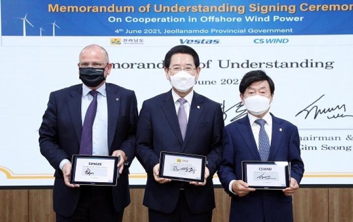 전라남도는 4일 주한덴마크대사관, 베스타스, 씨에스윈드와 해상풍력 사업 공동협력 업무협약을 했다. 이로써 앞으로 8.2GW 대규모 해상풍력 사업 추진에 탄력을 받을 전망이다.이날 전남도청에서 열린 협약식은 김영록 전남도지사와 아이너 옌센 주한덴마크대사, 헨릭 앤더슨 베