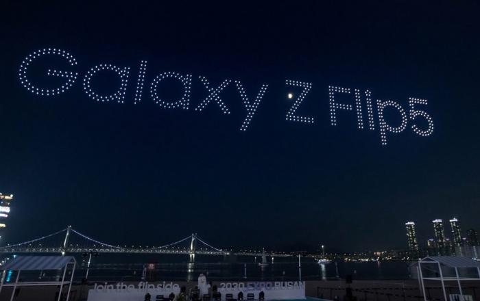삼성전자가 갤럭시 신제품을 체험할 수 있는 갤럭시 스튜디오 ‘ 부산 광안리’ 오픈을 기념해, 28일 부산 수영구 광안리해수욕장에서 ‘ 드론 라이트쇼(Drone Light Show)’를 진행했다. 이날 밤 8시부터 약 15분간 진행된 라이트쇼에는