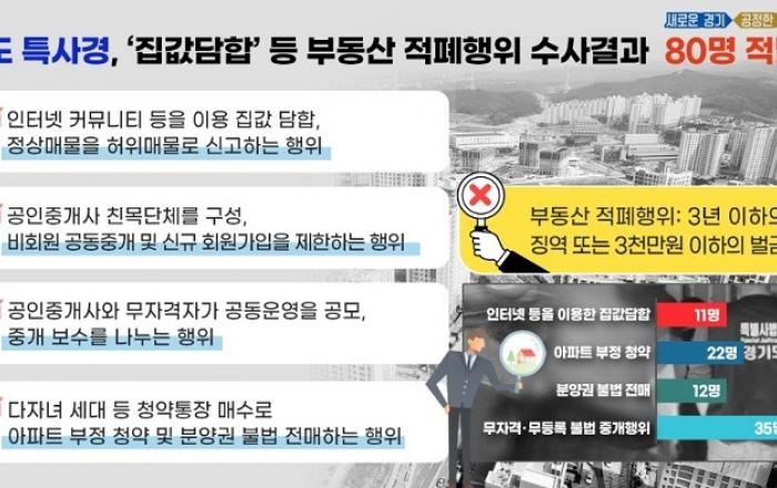 급매로 시세보다 싸게 나온 정상매물을 실거주자들이 담합해 허위매물로 신고하여 정상적인 중개행위를 방해하거나, 자격증이 없는데도 중개행위를 하는 등 부동산거래 질서를 교란시킨 불법행위자 80명이 경기도 수사에 대거 적발됐다.김영수 경기도 공정특별사법경찰단장은 3일 경기도