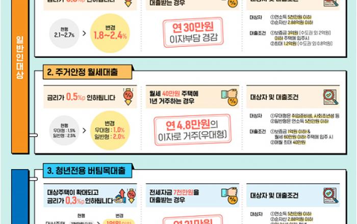 버팀목 전세대출 금리가 0.3%p 인하되고 주거안정 월세대출의 금리도 일반형·우대형 모두 0.5%p낮아진다. 국토교통부는 지난 3월 발표한 ‘주거복지로드맵2.0’, 7월의 ‘주택시장 안정 보완대책’ 등에 따른 무주택 실수요자 주거지원 강화의 일환으로 주택도시기금 운용