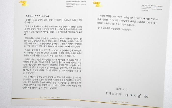 이재명 경기도지사가 연 24%에 이르는 등록 대부업체의 고금리를 10%까지 낮춰달라고 더불어 민주당 대표단 등 여당에 건의했다.7일 경기도에 따르면 이재명 지사는 이런 내용을 담은 편지를 이날 더불어민주당 대표단과 소속 국회의원 176명 전원에 보내 ‘대부업 법정 최고