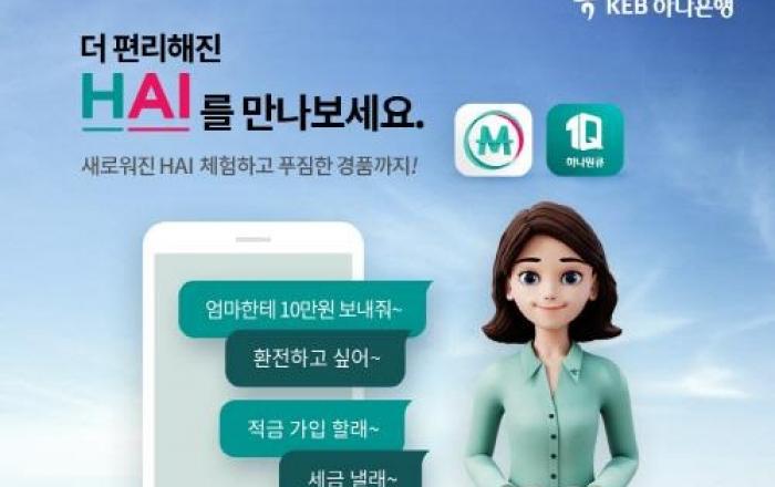 KEB하나은행은 인공지능 하이(HAI)뱅킹 서비스 고도화 프로젝트를 진행했다고 17일 밝혔다.고도화 프로젝트를 통해 손님 이용 프로세스 개선과 개인화 마케팅 기반을 마련하였으며, 이와 함께 12월 말까지 이벤트도 실시한다.하이(HAI)뱅킹은 대화형 뱅킹 서비스로, 지난