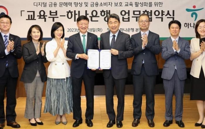 하나은행은 디지털 금융거래 확산으로 금융서비스에서 소외되고 있는 금융소비자들을 보호하기 위해 교육부(사회부총리 겸 교육부 장관 이주호)와 '디지털 금융 문해력 향상 및 금융소비자 보호 교육 활성화'를 위한 업무협약을 체결했다고 밝혔다. 이번 업무협약으로 하나은행은