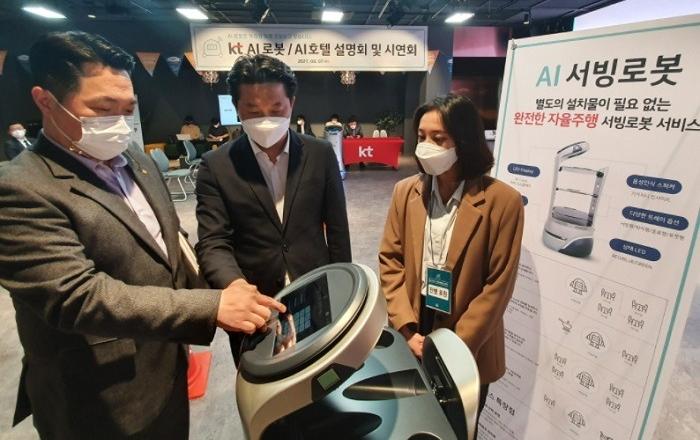 KT는 7일 오후 부산광역시 부산진구 e스포츠아레나에서 부산지역 호텔업계 관계자들을 대상으로 KT ‘AI 호텔로봇’과 ‘AI 서빙로봇’, 국내 유일 호텔 전용 인공지능서비스 ‘AI 호텔’ 등 호텔 전용 AI 솔루션 시연 행사를 개최하며 관광 도시 부산에 진출한다고 밝혔