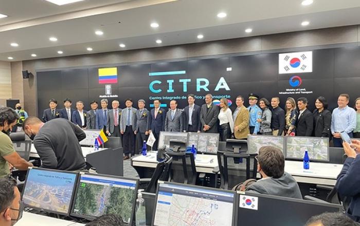 한국형 지능형교통체계(K-ITS)가 중남미 지역에 진출했다.국토교통부는 K-ITS를 기반으로 한 통합교통정보센터(CITRA)가 콜롬비아 메데진시에서 개소했다고 23일 밝혔다.▲ 콜롬비아 메데진시 통합교통정보센터 준공식에서 양국 참석자들이 기념촬영을 하고 있다.(사진=국