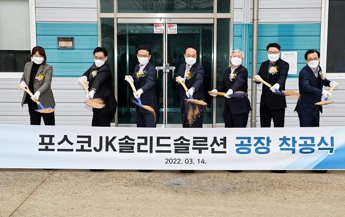 포스코그룹이 14일 경상남도 양산시에 전기차용 전고체전지 핵심소재인 고체전해질 공장을 착공하고 차세대 배터리 시장 선점에 나선다.착공식에는 포스코홀딩스 유병옥 친환경미래소재팀장, 이경섭 이차전지소재사업담당, 포스코JK솔리드솔루션 김태흥 대표이사 등이 참석했다.▲ 14일