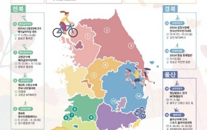 산림청은 올가을 전국 각지에서 열리는 산림레포츠 대회 정보를 한눈에 볼 수 있는 ‘2024 산림레포츠 대회지도’를 발간해 배포한다고 25일 밝혔다.올해 국내에서 개최되는 산림레포츠대회는 모두 42개로 그 중 올가을에는 총 20개의 대회가 열릴 예정이다. 대표적으로 △울