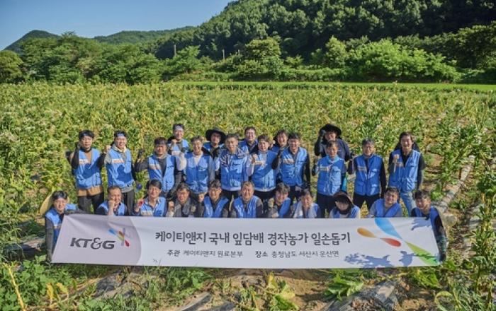 KT&G가 일손 부족으로 어려움을 겪는 잎담배 농가를 돕기 위해 지난 4일 충남 서산시 운산면에서 잎담배 수확 봉사활동을 진행했다. 잎담배 농사는 한여름철인 7∼8월에 수확이 이뤄지며, 기계화가 어렵고 대부분 수작업으로 진행돼 노동 강도가 높다. 잎담배 농가들은 농