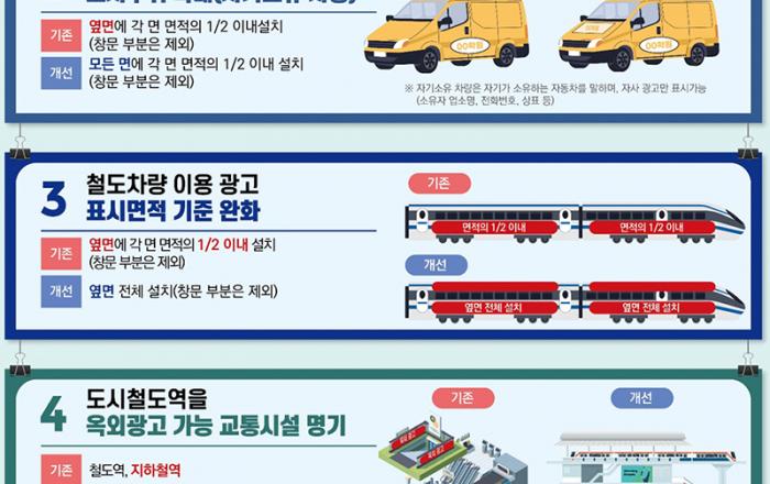 앞으로 택시와 버스 등에 부착하는 광고물을 창문을 제외한 모든 면까지 허용된다. 또한 대학도 옥외와 벽면 등에 상업광고가 가능하고 경전철과 모노레일 등 도시철도역에도 옥외광고가 가능하다. 행정안전부는 차량 광고 표시 부위 확대 등 규제를 완화하고, 공공목적 광고물의 주