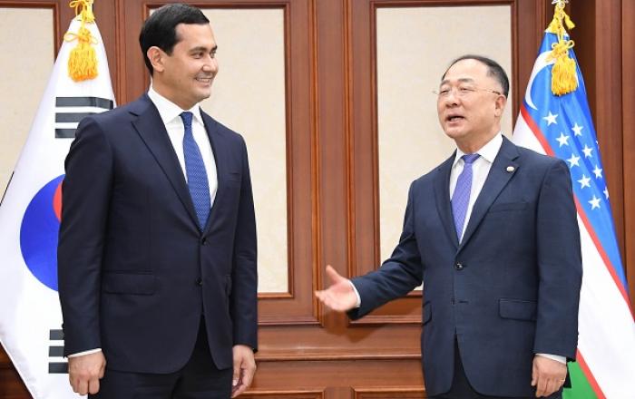 한국이 우즈베키스탄과 자유무역협정(FTA) 추진을 위해 협력을 강화하기로 했다. 홍남기 부총리 겸 기획재정부 장관은 7일 오후 3시 정부서울청사에서 사르도르 우무르자코프 우즈베키스탄 부총리 겸 투자대외무역부장관과 경제부총리 회의를 열고 이같이 뜻을 모았다.▲ 홍남기