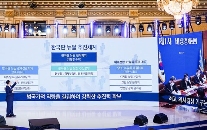 문재인 대통령은 14일 “한국판 뉴딜은 선도국가로 도약하는 ‘대한민국 대전환’ 선언”이라고 밝혔다. 문 대통령은 이날 청와대 영빈관에서 열린 ‘한국판 뉴딜 국민보고대회’에서 “추격형 경제에서 선도형 경제로, 탄소의존 경제에서 저탄소 경제로, 불평등 사회에서 포용 사회