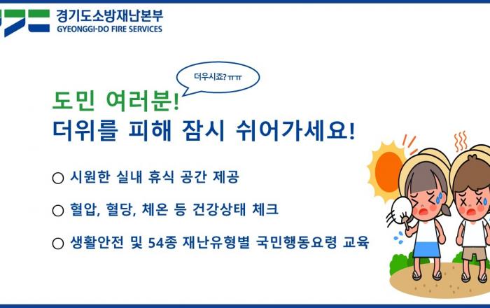 “119안전센터에 마련된 무더위쉼터에서 올여름 더위를 날려버리세요.” 경기도소방재난본부는 12일부터 9월 30일까지 도내 119안전센터 199곳에 ‘무더위쉼터’를 운영한다고 11일 밝혔다. 무더위쉼터에는 생수 등 간