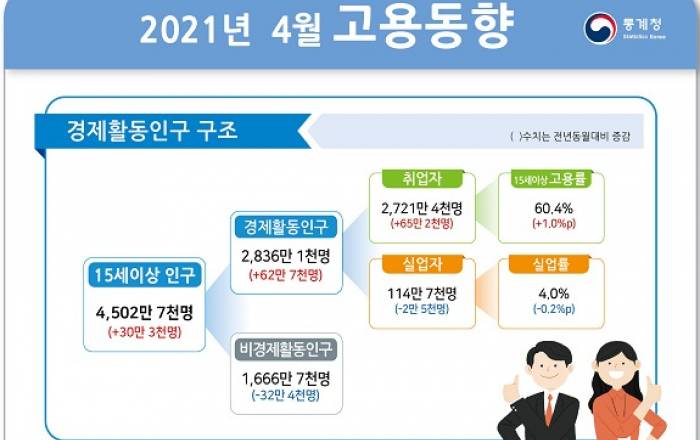 4월 취업자가 6년 8개월 만에 가장 큰 폭으로 증가했다.통계청이 12일 발표한 ‘4월 고용동향’에 따르면 지난달 취업자 수는 2721만 4000명으로 전년 동월 대비 65만 2000명 늘었다.증가 폭은 2014년 8월(67만명) 이후 가장 컸다.취업자 수는 코로나19