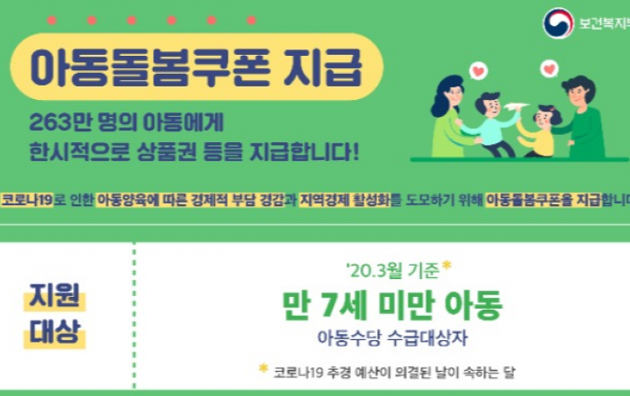 보건복지부는 코로나19로 위축된 지역경제를 활성화하고 아동양육가구의 부담을 줄이기 위해 ‘아동돌봄쿠폰’을 지급할 계획이라고 밝혔다.아동돌봄쿠폰은 아동수당을 지급받는 만 7세 미만의 자녀를 둔 가구에 아동 1인당 40만 원 상당의 상품권 등을 국비로 긴급지원하는 사업으로