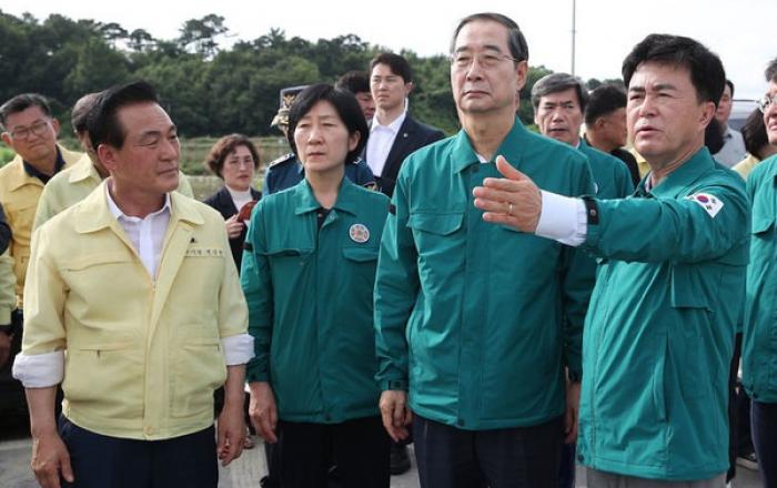 한덕수 국무총리는 16일 오후 16시 30분 충남 논산사 성동면 인근의 논산천 제방 유실 현장을 방문해 응급복구 상황을 점검하고 원봉초등학교 등에 마련된 대피시설을 찾아 이재민들을 위로했다. 한 총리는 백성현 논산시장으로부터 응급복구 상황 등을 보고 받고 “인명피