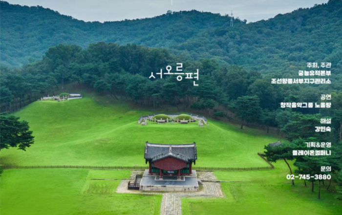 문화재청 궁능유적본부 조선왕릉서부지구관리소는 오는 10월 14일(토) 오전 11시와 오후 2시에 서오릉(경기 고양시) 재실 마당에서 해설과 함께 서오릉을 소재로 창작한 전통음악 공연을 감상하고, 다양한 체험을 할 수 있는 ‘음악 속 왕릉이야기_서오릉편’행사를 개최한다.