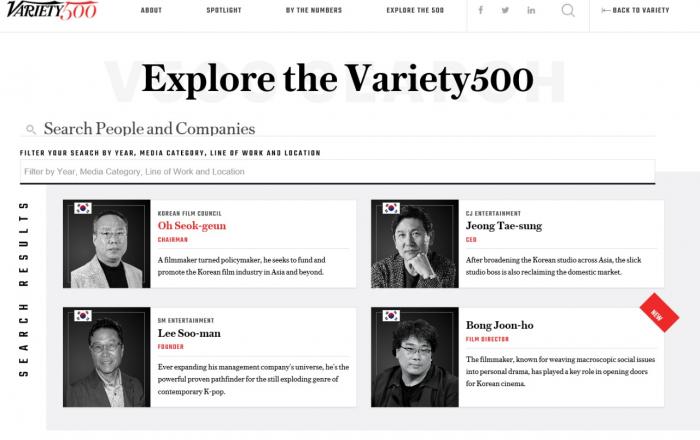 미국 아카데미 영화상 작품상 등 주요 부문 후보에 올라 주목 받고 있는 의 봉준호 감독과 영화진흥위원회 오석근 위원장이 미국 엔터테인먼트 전문매체 ‘버라이어티(Variety)’가 선정한 ‘세계 엔터테인먼트 리더 500인’에 선정됐다. ‘버라이어티(Variety)’는 봉