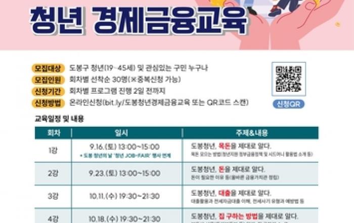 도봉구가 사회초년생 등 청년의 실전 경제금융지식 함양과 안정적인 자산 관리를 지원하기 위해 오는 9월 16일부터 10월 25일까지 서울창업허브 창동 대강당에서 '청년 경제금융교육'을 운영한다. 교육 프로그램은 총 5회로 구성됐으며 '제대로 알면 돈이 보인다'를 주