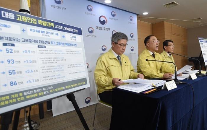 정부가 코로나19로 인한 고용충격을 신속히 흡수하기 위해 10조원 규모의 고용안정 특별대책을 추진한다.또 코로나19로 고사 위기에 놓인 항공·해운·자동차·전력 등 기간산업 중심으로 40조원 규모의 안정기금도 조성하기로 했다. 정부는 22일 문재인 대통령 주재로 제 5차
