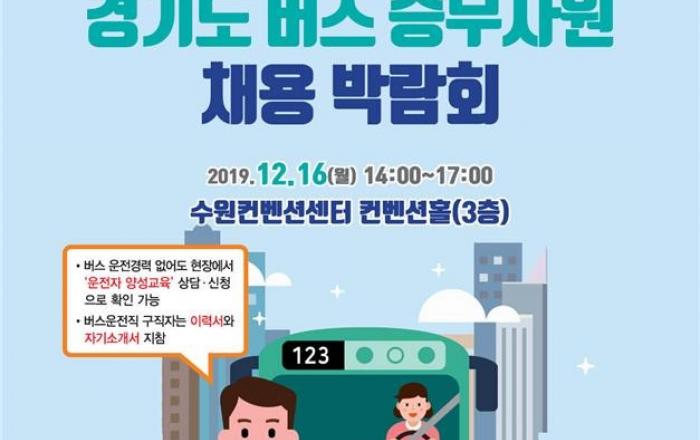 국토교통부와 경기도는 한국교통안전공단 , 경기도버스운송사업조합과 함께 오는 12월 16일(월) 14시부터 17시까지 수원컨벤션센터에서 「제4회* 경기도 버스승무사원 채용박람회」를 개최한다고 밝혔다.이번 제4회 박람회는 올해의 마지막 채용박람회로 경기도·수원시 중장년 취