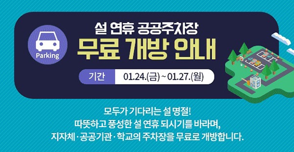 한편 올해 설 연휴 기간에 개방하는 전국의 무료 개방 공공주차장은 총 1만 7572개로 지난해 추석 연휴 기간보다 936개가 늘었고 지역별로는 경기도 3765개, 경상남도 2308개 등이다.