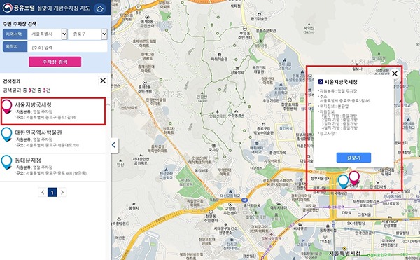 이용자는 원하는 지역을 선택하면 되는데, 화면 왼쪽에는 해당 지역에 있는 무료 개방 공공주차장 목록이 나타나고 오른쪽에는 지도와 함께 주차장 위치가 표시되는 방식이다.