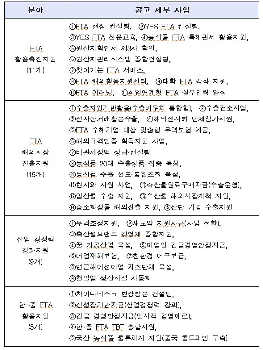 FTA 활용 촉진(11개), FTA 해외시장 진출(15개), 산업경쟁력 강화(9개), 한·중 FTA 활용(5개) 등 4개 분야 40개 사업으로 구분되며, 예산은 5652억원이 책정됐다. 이는 지난해보다 약 10% 증가한 규모다.