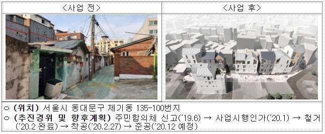 제기동 주민합의체 유영미 대표는 “동대문구청, 한국감정원 통합지원센터의 지원으로 초기사업성 분석부터 착공까지 차질 없이 사업을 진행할 수 있었다.”면서,