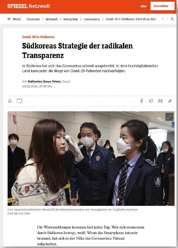 “한국의 급진적 투명성 전략, 바이러스 이해 단초 제공” - 2월 29일, 슈피겔 온라인