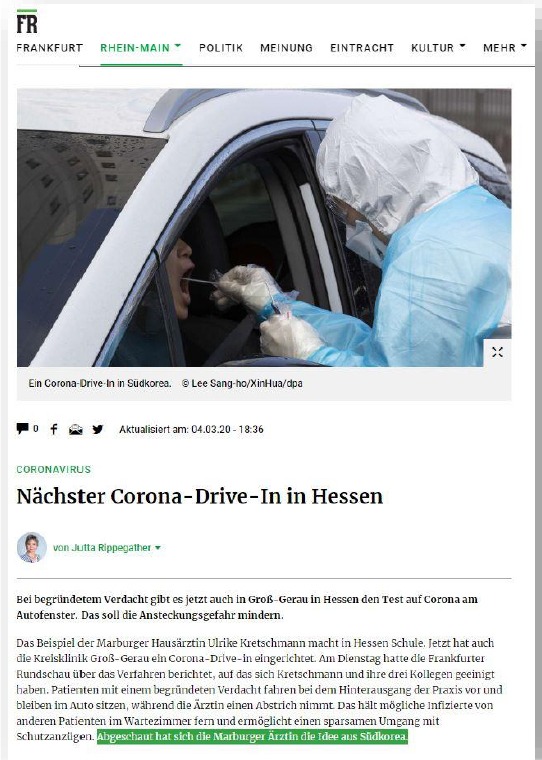 “독일에서도 한국을 따라서 3월1일 부터 드라이브 인(drive-in) 선별진료소를 설치… 독일 헤센주, 한국의 사례를 모범 삼아…독일에서도 방문자들의 반응이 아주 좋아”